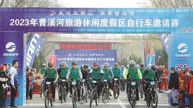 三月十九日,孝义市文化和旅游局主办的“生态玉泉山 康养曹溪河”曹溪河旅游休闲度假区自行车邀请赛开赛,一百二十余名自行车骑行爱好者参赛。 (蒋建林 摄)