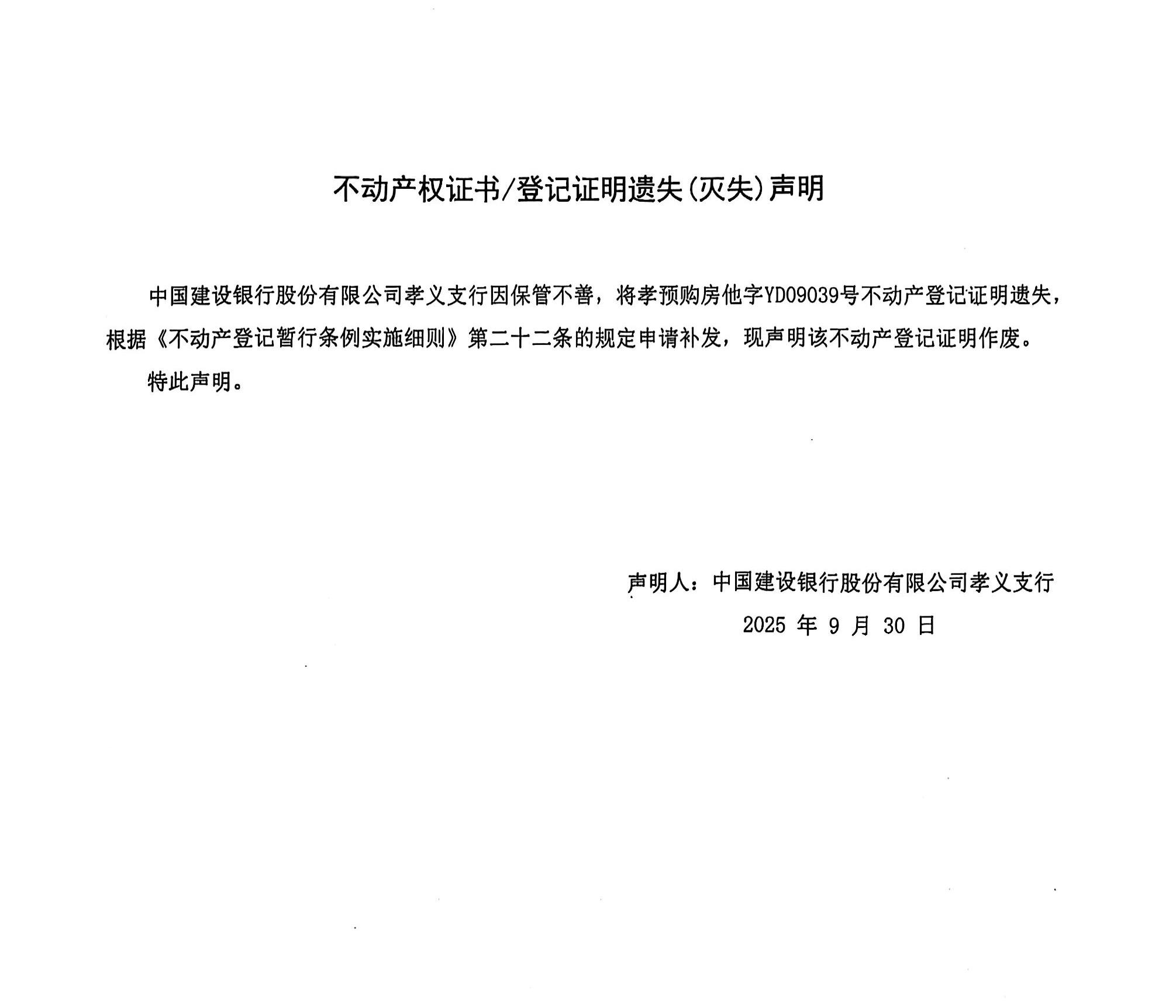 不动产权证书遗失声明(中国建设银行股份有限公司孝义支行)