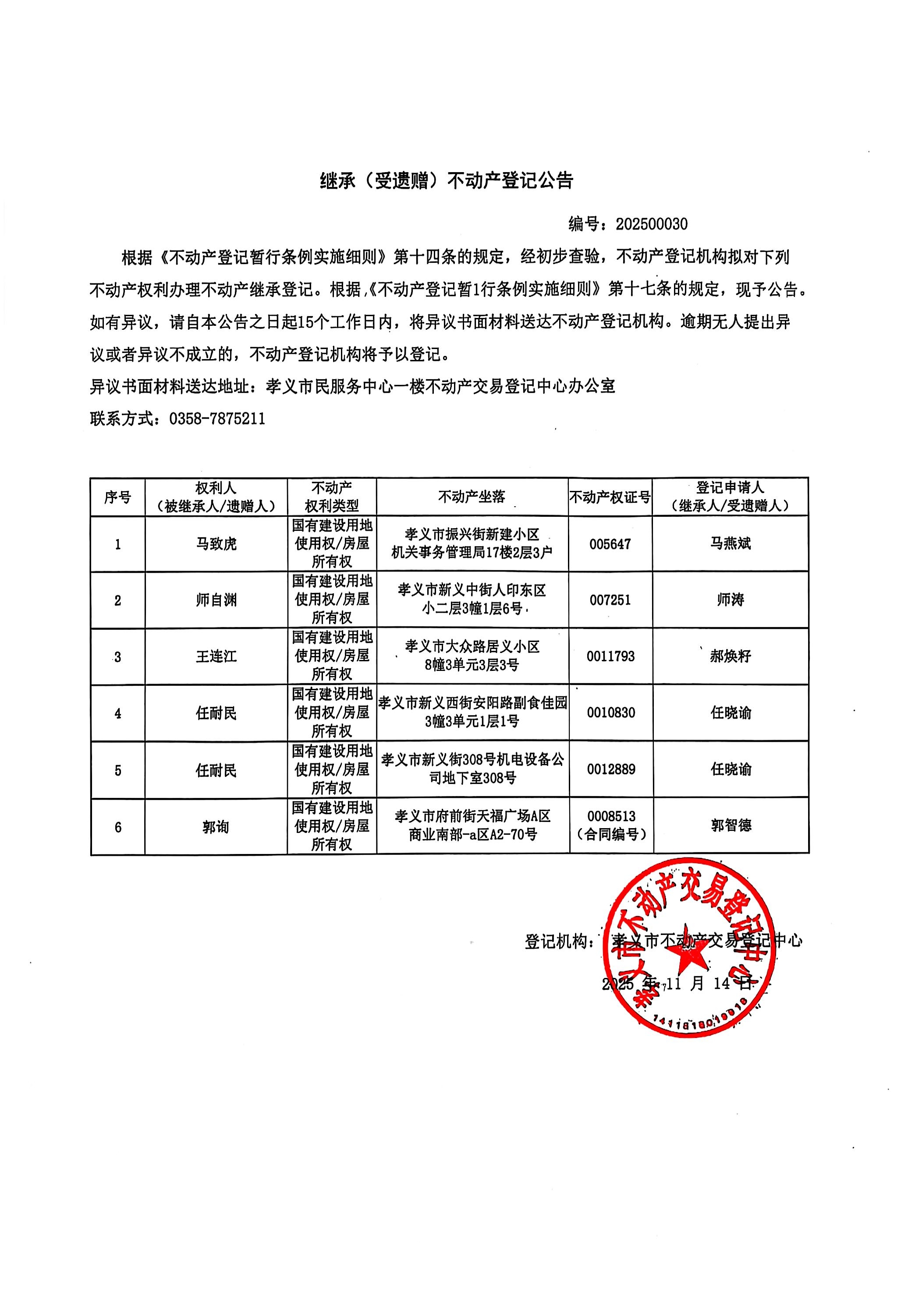 继承(受遗赠)不动产登记公告[202500030]