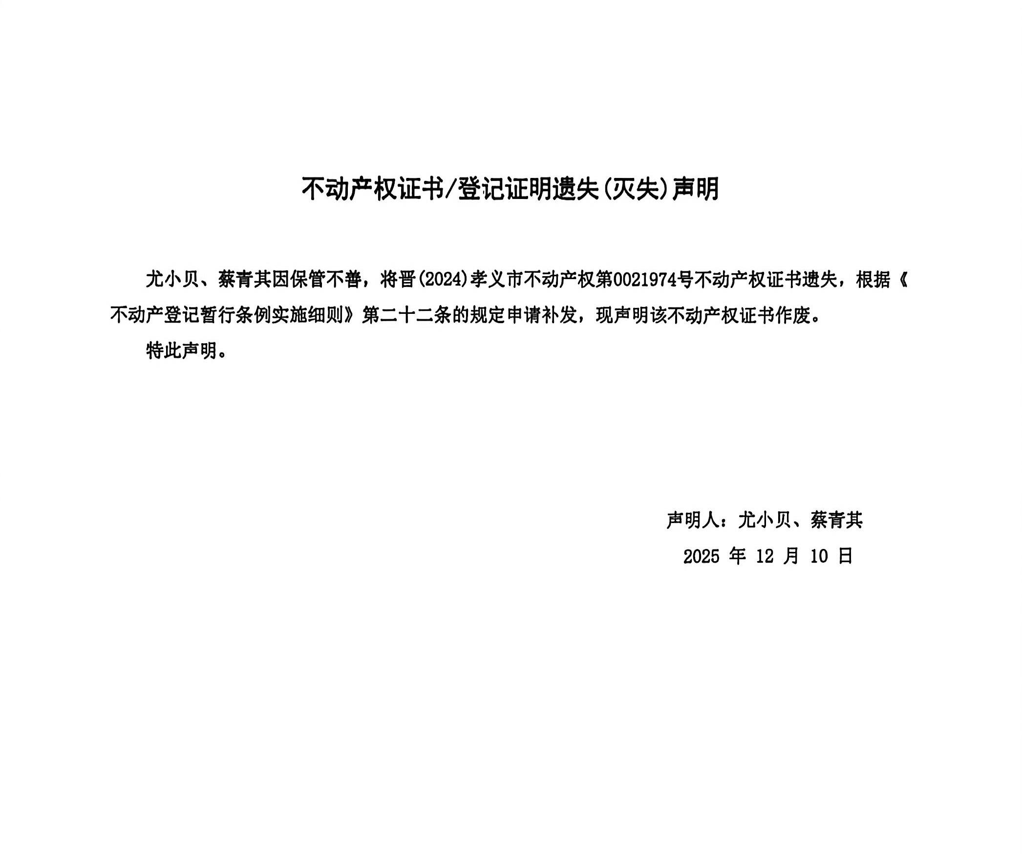 不动产权证书遗失声明(尤小贝、蔡青其)