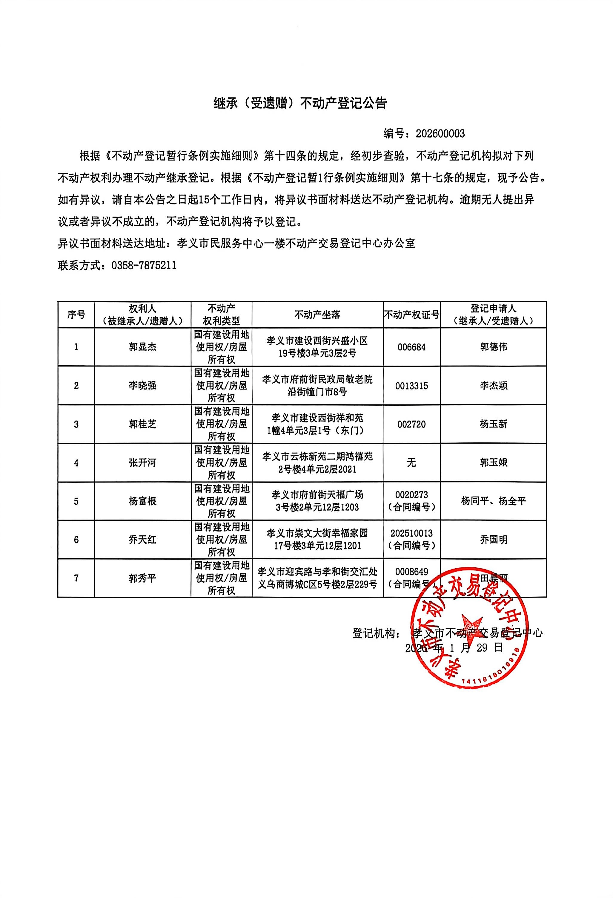 继承(受遗赠)不动产登记公告[202600003]