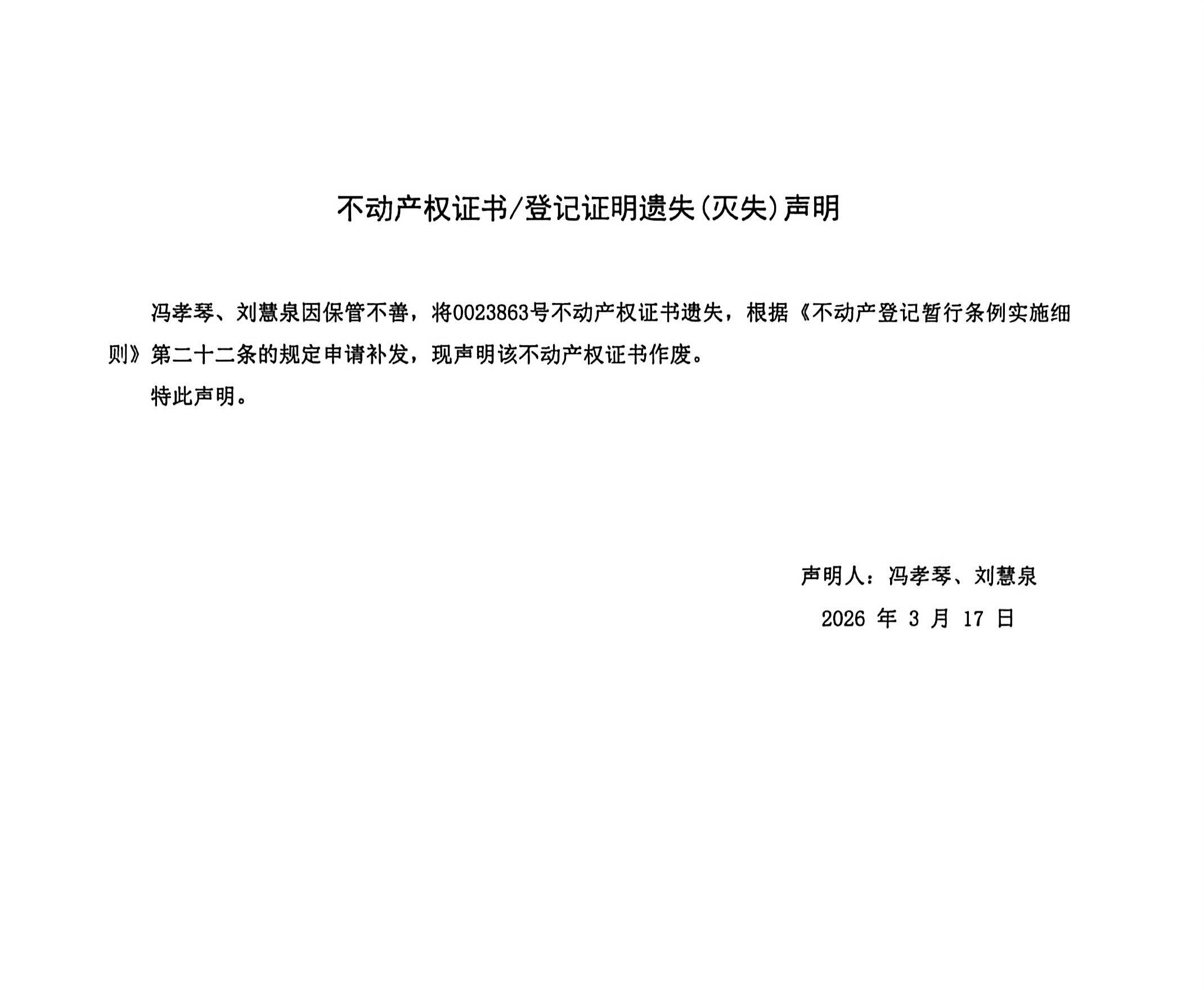 不动产权证书遗失声明(冯孝琴、刘慧泉)