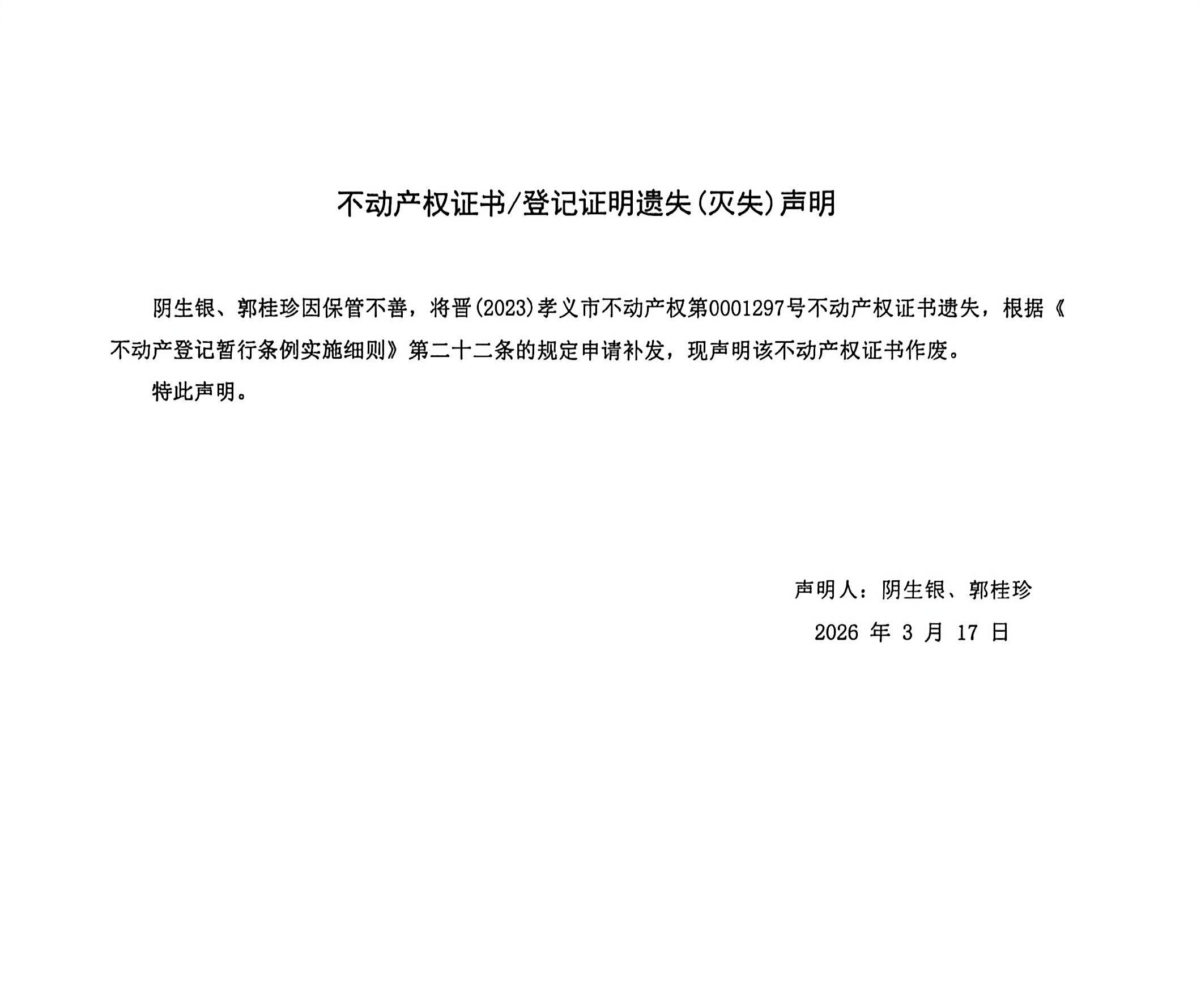不动产权证书遗失声明(阴生银、郭桂珍)