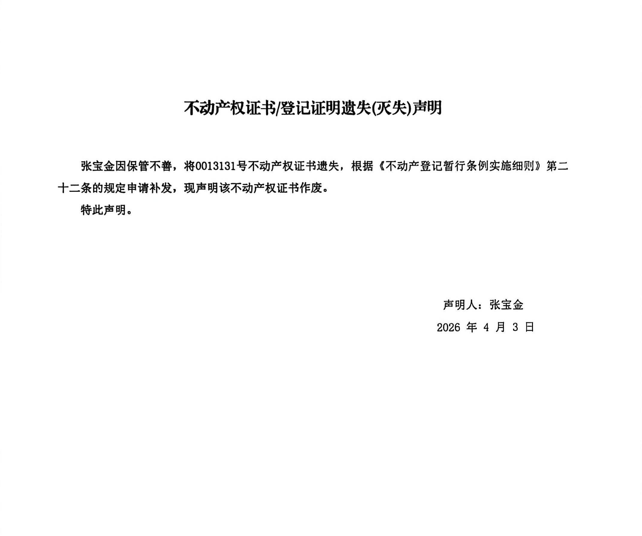 不动产权证书遗失声明(张宝金)